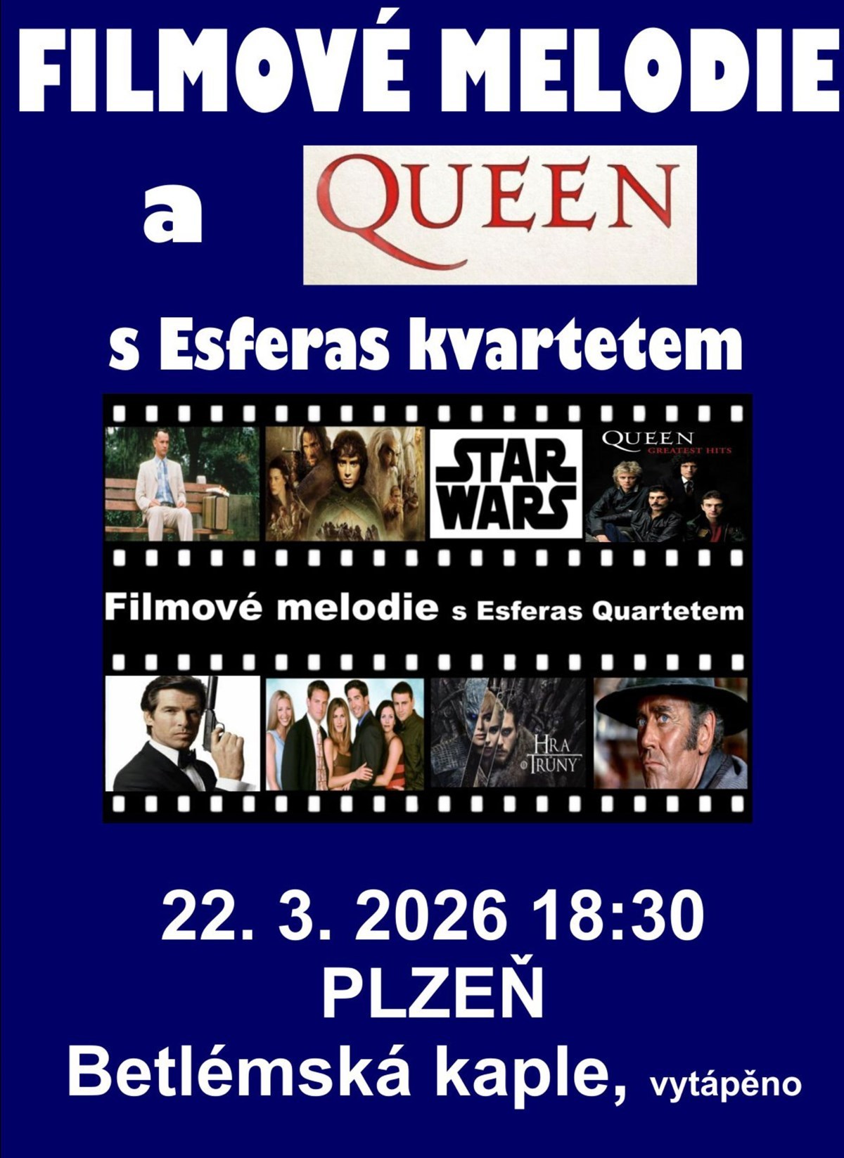 Pojďte si užít zbrusu nový program, který v zajímavé dramaturgii kombinuje aranže písniček skupiny Queen s filmovou hudbouze známých filmů v úpravě pro Esferas kvarteto do vytápěné Betlémské kaple