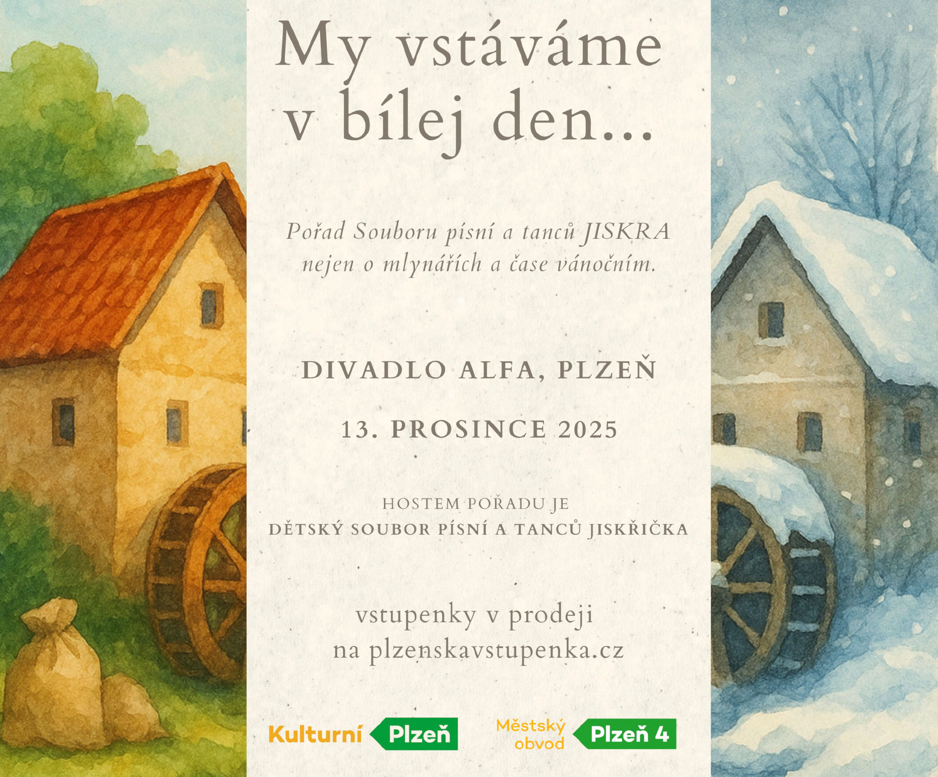 Přijďte se v předvánočním čase příjemně naladit s folklorním souborem písní a tanců Jiskra. V jediný večer tak ožije svět práce, hudby i lidové zábavy – svět, který má duši, rytmus a radost z pohybu. Přijďte s námi prožít návrat k tradicím a lidovým zvyklostem a naladit se na nejkrásnější svátky v roce.