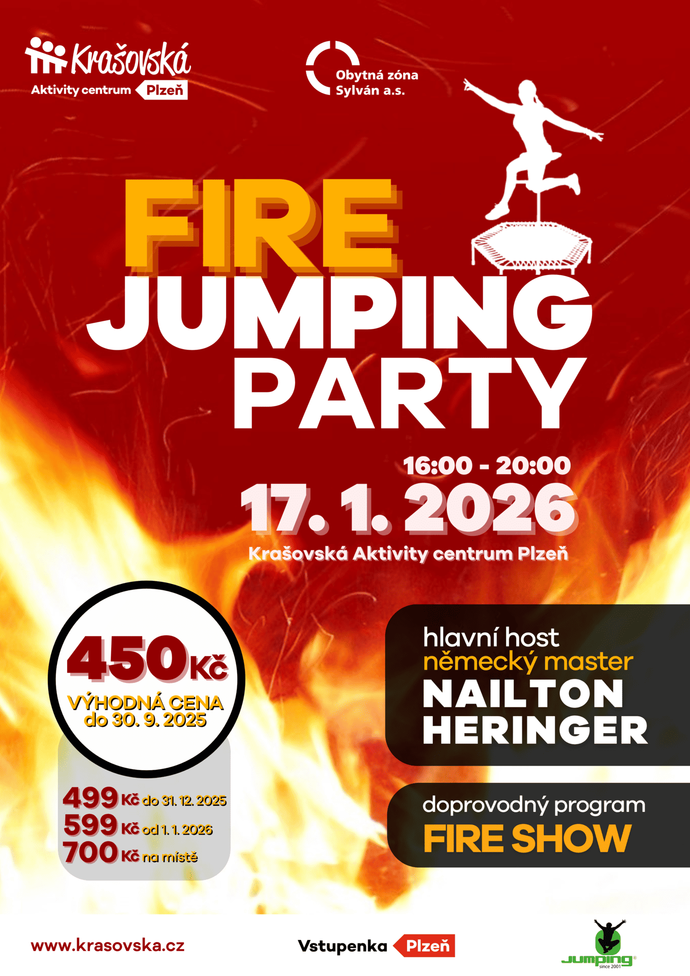FIRE JUMPING PARTY je žhavá show, která rozzáří lednový večer. Tentokrát opět s naším hlavním hostem, legendou a ikonou jumpingu – německým masterem Nailtonem Heringerem. Společně s TOP certifikovanými instruktory předvedou nezapomenutelné vystoupení na trampolínkách plné síly, hudby a energie. Nově vás čeká také doprovodná FIRE SHOW, která rozpálí i zimní Plzeň.