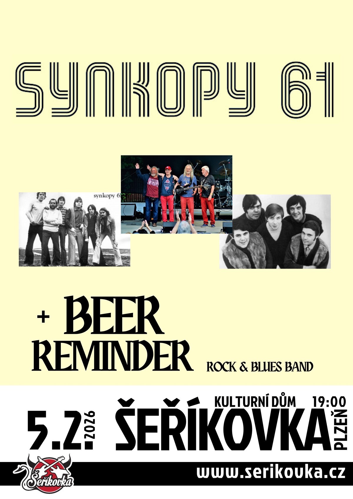 SYNKOPY 61 + Beer Reminder Připravte se na hudební událost, která se ponese v duchu poctivého rocku! Na pódiu plzeňské Šeříkovky setkají dvě generace rocku: nestárnoucí legendy Synkopy 61 a energická formace Beer Reminder.